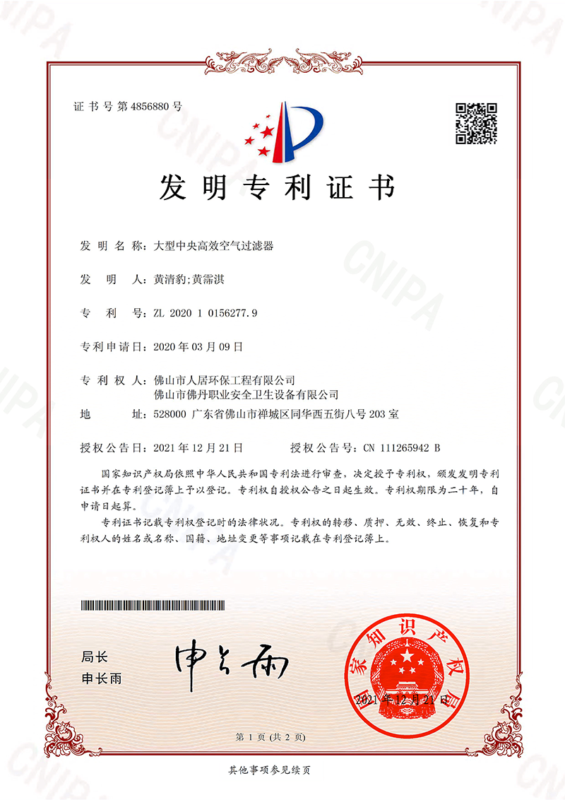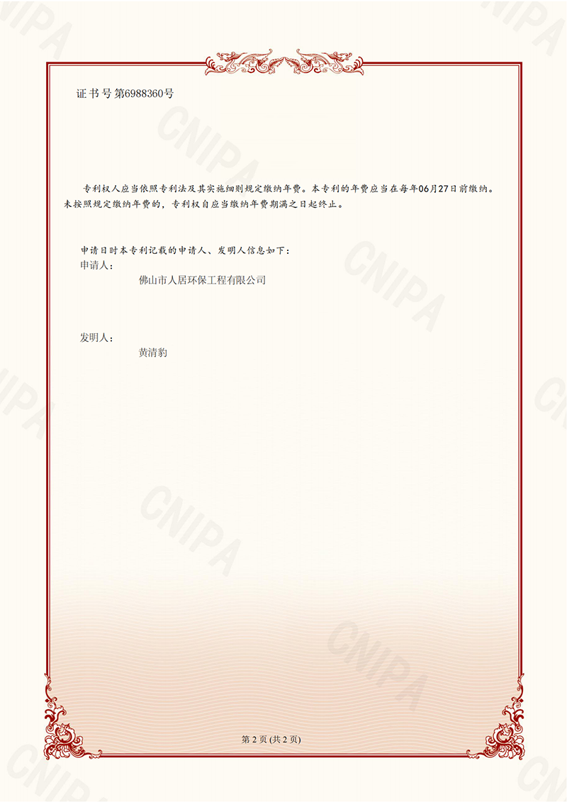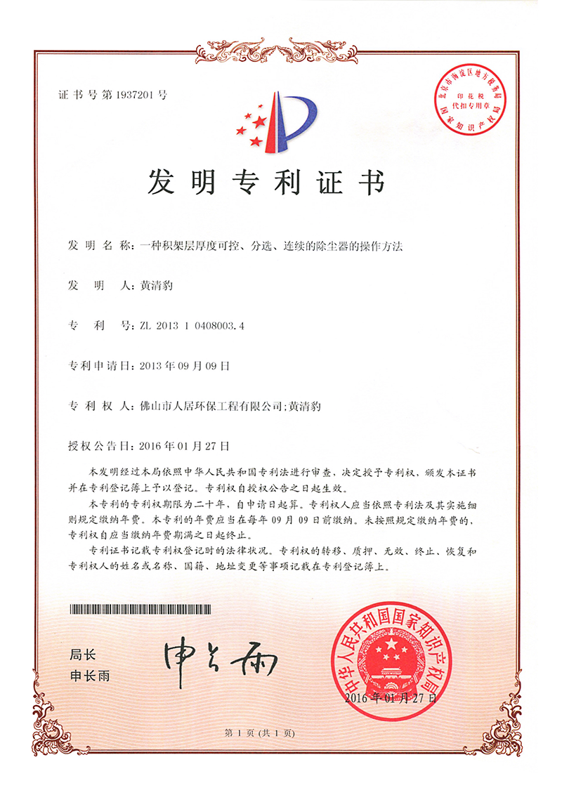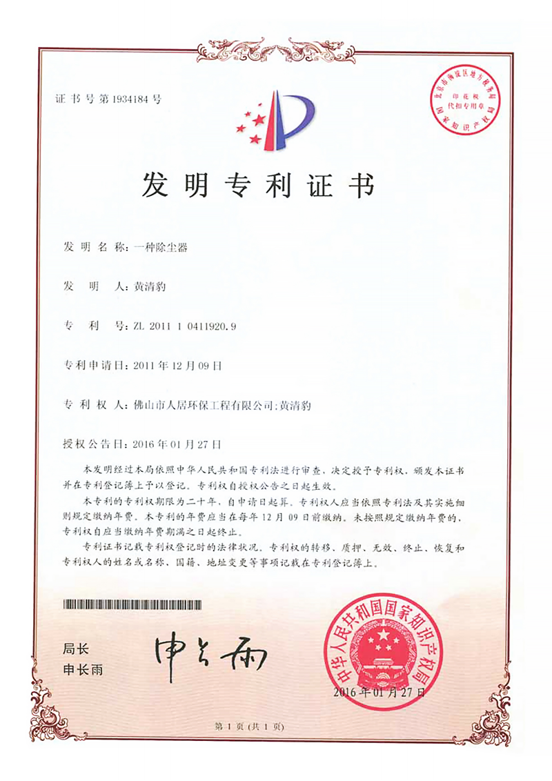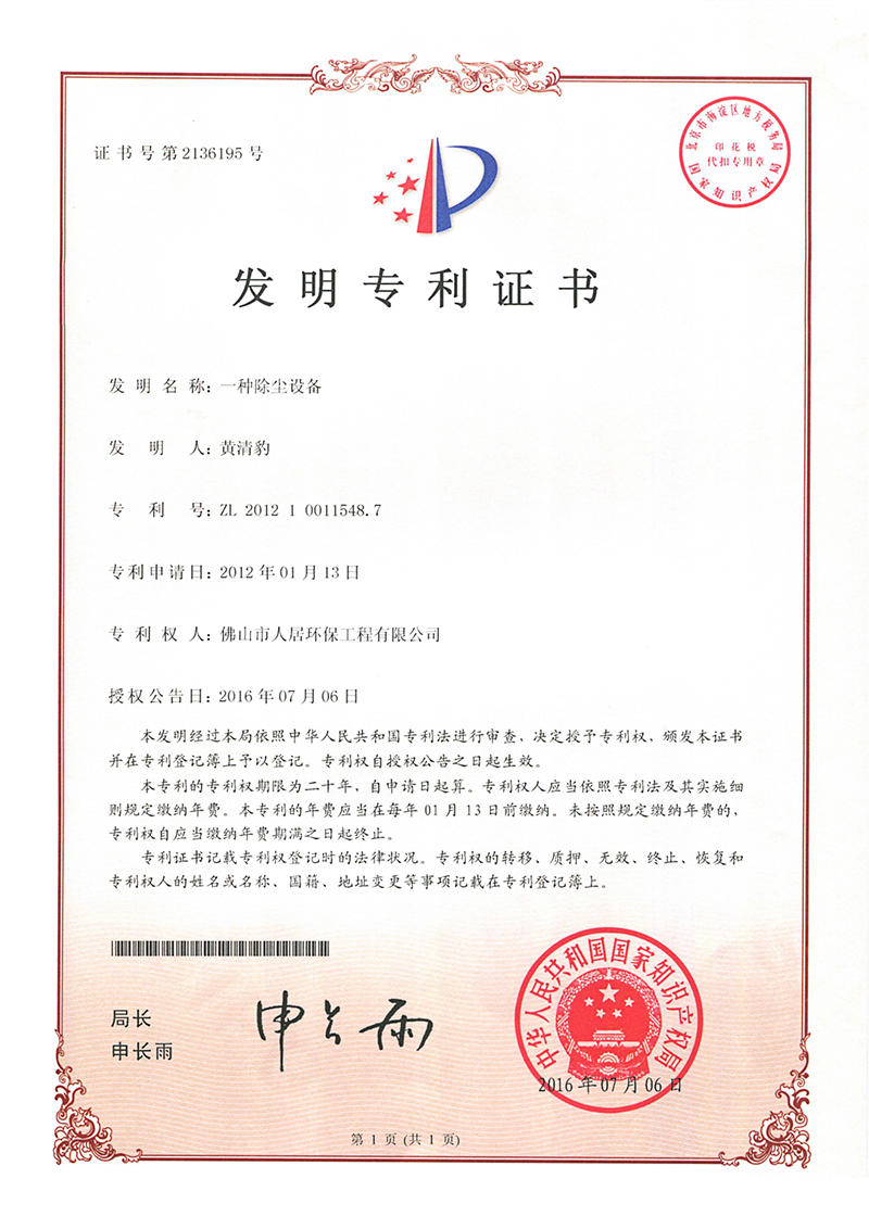 发明专利证书10:中央除尘系统(人居-2024)