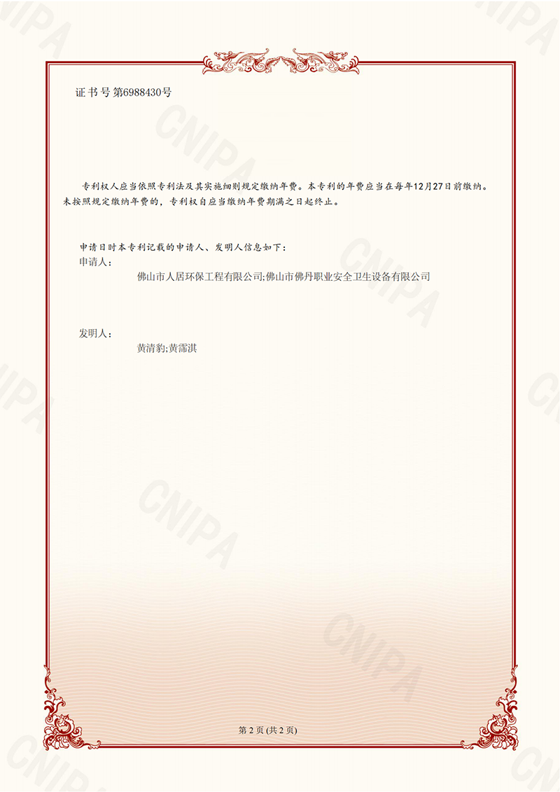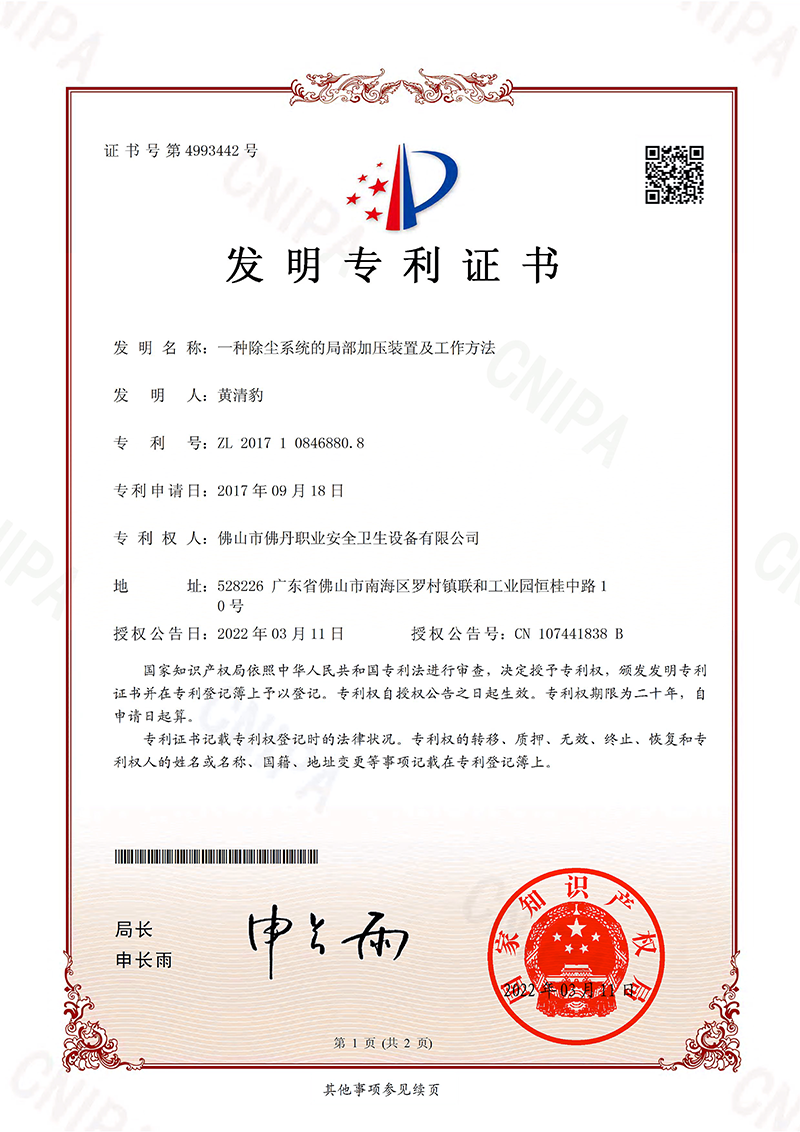 发明专利证书7:一种除尘系统的局部加压装置及工作方法(佛丹-2022)