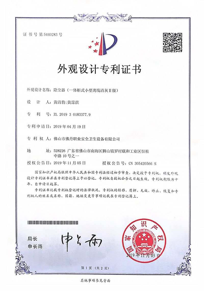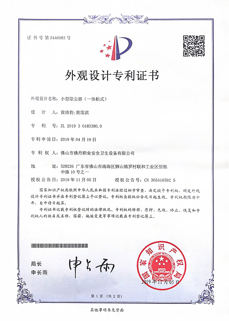 外观专利1:一体柜式小型除尘器(佛丹-2019) 外观专利2:一体柜式小型离线清灰Ⅱ级除尘器(佛丹-2019)